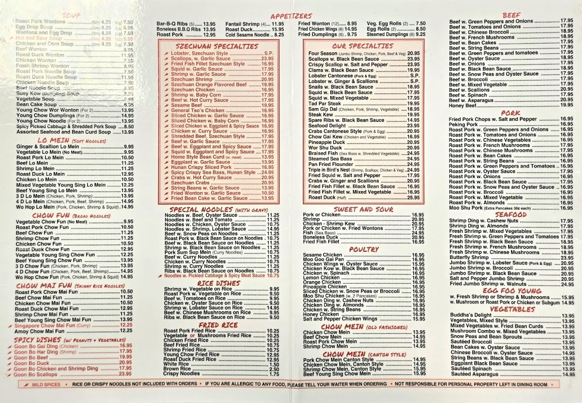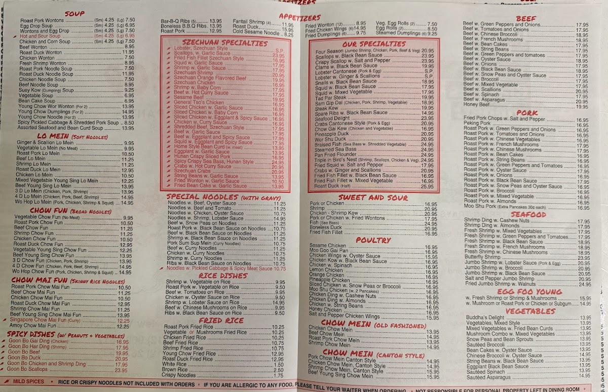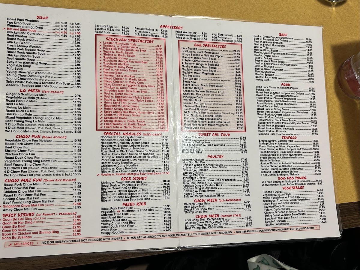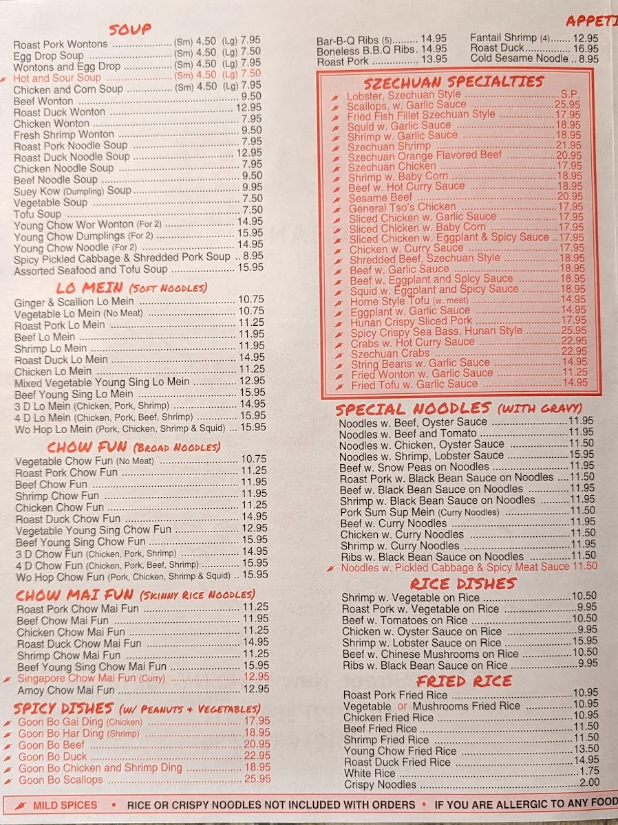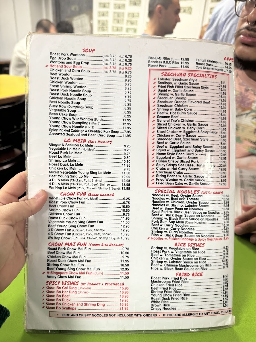 Wo Hop offers a straightforward menu rooted in traditional Cantonese flavors, ideal for those seeking a satisfying and unpretentious meal. The menu features comforting classics like Hot and Sour Soup, Beef Young Sing Chow Fon, and Shrimp Lo Mein alongside heartier dishes such as Kung Pao Chicken and Roast Pork Fried Rice. This selection fits well within the casual, lively atmosphere, making it a popular spot for both quick lunches and relaxed dinners.